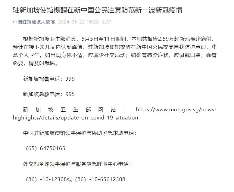 5月22日,中国驻新加坡使馆指示在新中国公民提神留神新一波新冠疫情。全文如下: